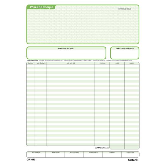 | Póliza cheque en duplicado tamaño carta, Fortec, de papel bond de 68g -/ 56g, 1 paquete con 3 blocks de 25juegos c-/u. |