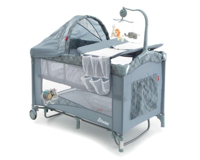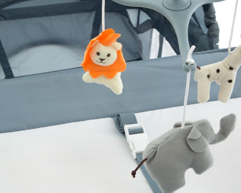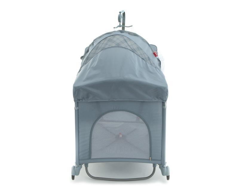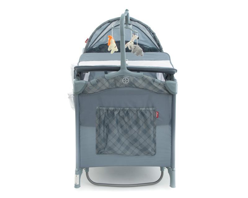 También incluye un práctico cambiador de pañales con correa de seguridad, así como un tierno carrusel musical para entretener a tu bebé. Su diseño color gris es perfecto para combinar en la habitación, también cuenta con una capota abatible con tela que evita el paso de mosquitos.